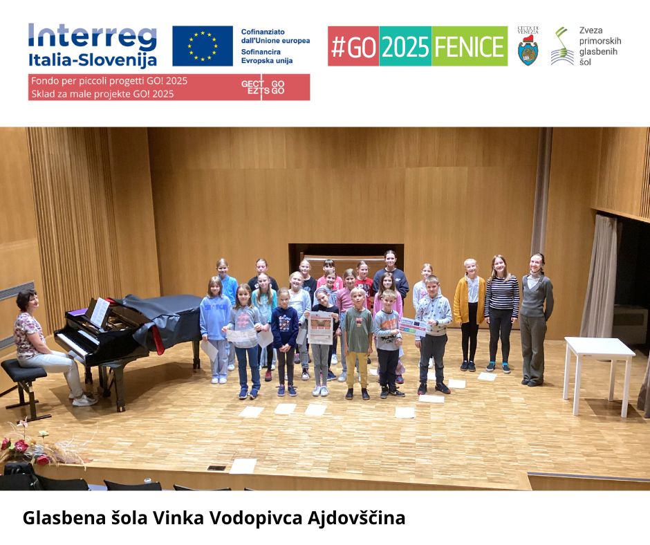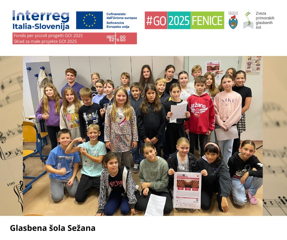 Foto scuole della Slovenia Concorso #GO2025FENICE 🇮🇹 Ecco le foto delle scuole della Slovenia (ZPGŠ – Associazione delle scuole di musica del litorale sloveno) che partecipano al Concorso #GO2025FENICE. Dal 15 dicembre al 15 gennaio 2025 si potrà votare su YouTube il loro video musicale sull’Inno alla Gioia di Beethoven.